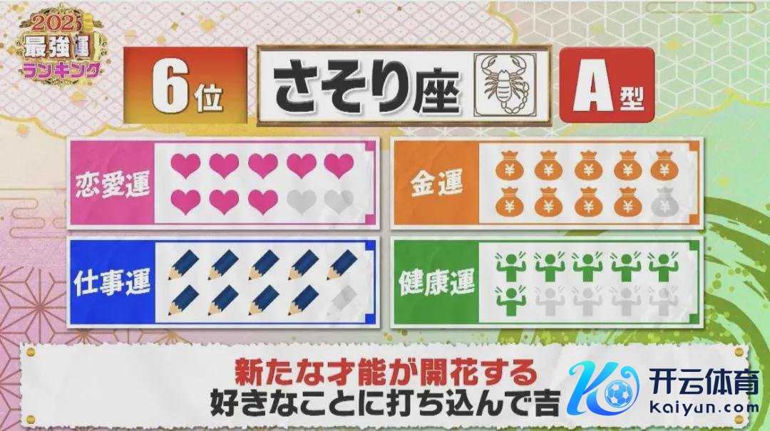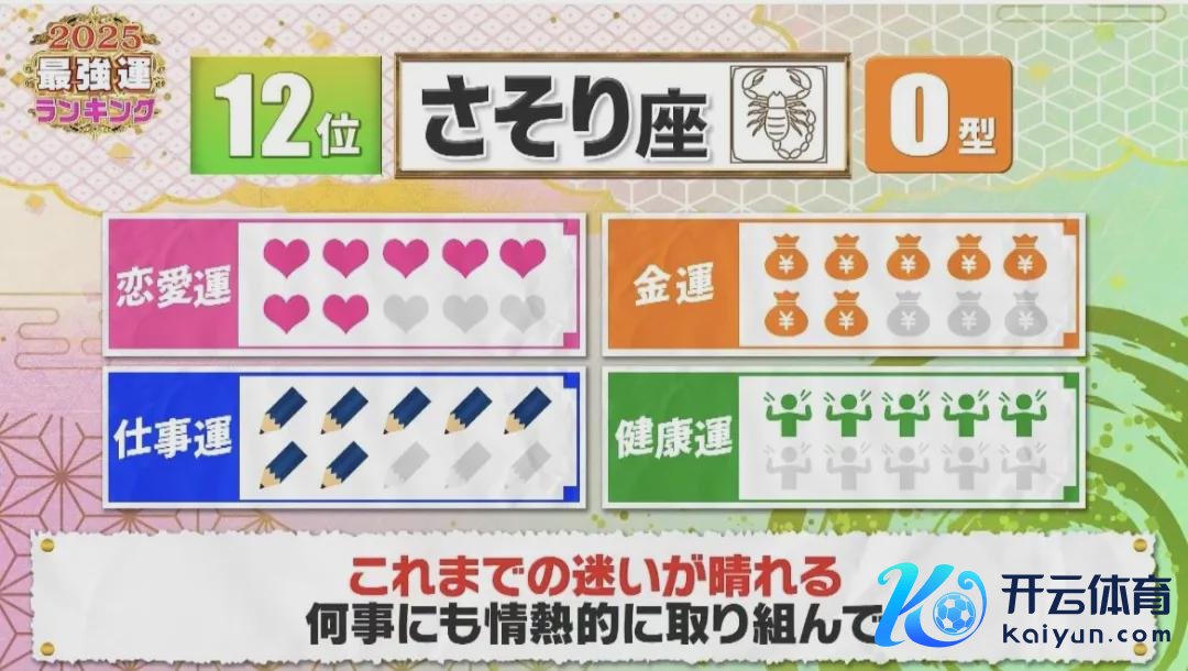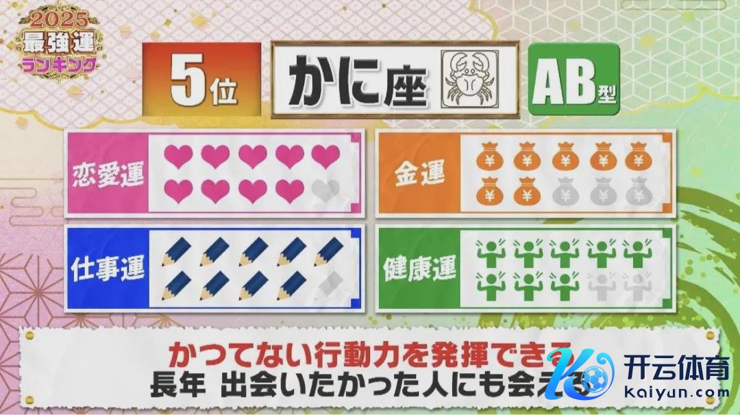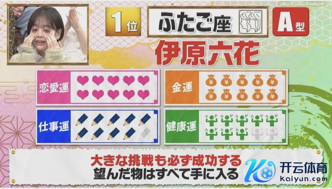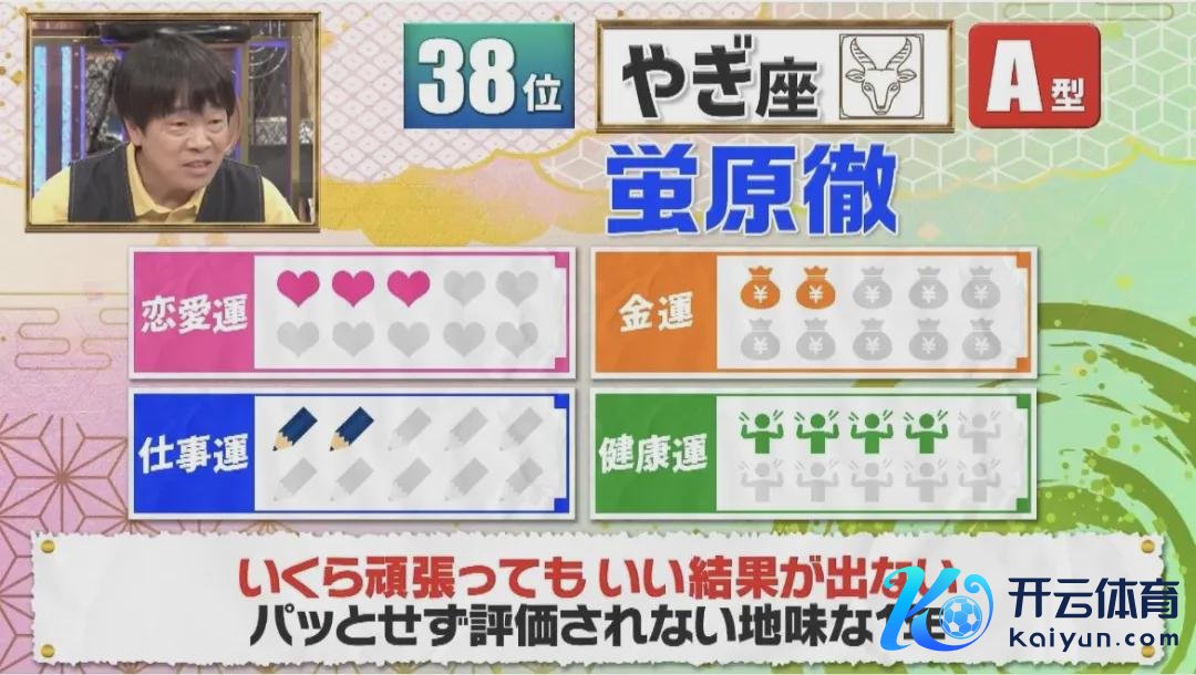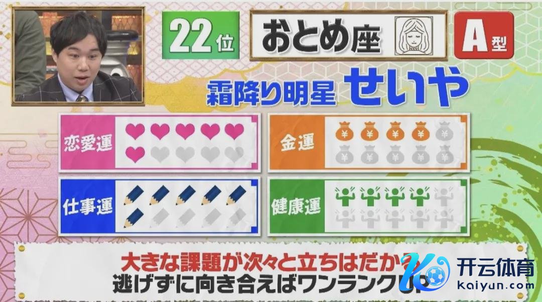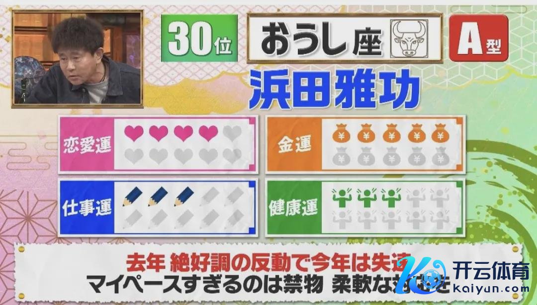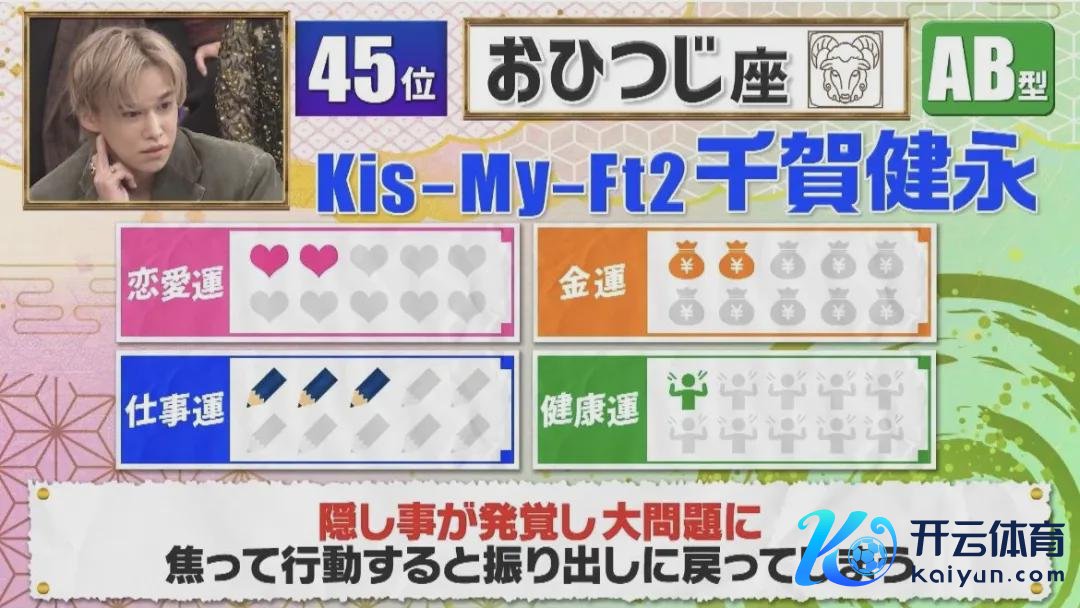 日本东谈主气综艺『ダウンタウンDX』,每年皆会邀请着名占卜师水晶玉子,劝诱星座和血型,从恋爱运、财气、使命运和健康运四个方面作念个大起底,排出1-48名的新年运势榜单。