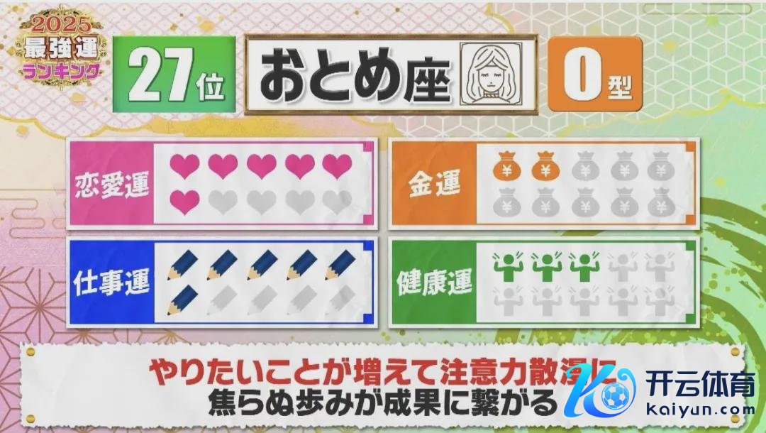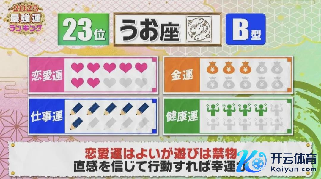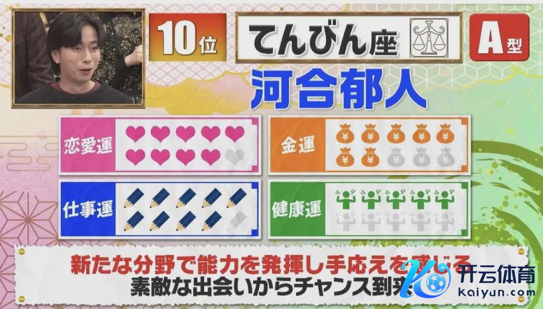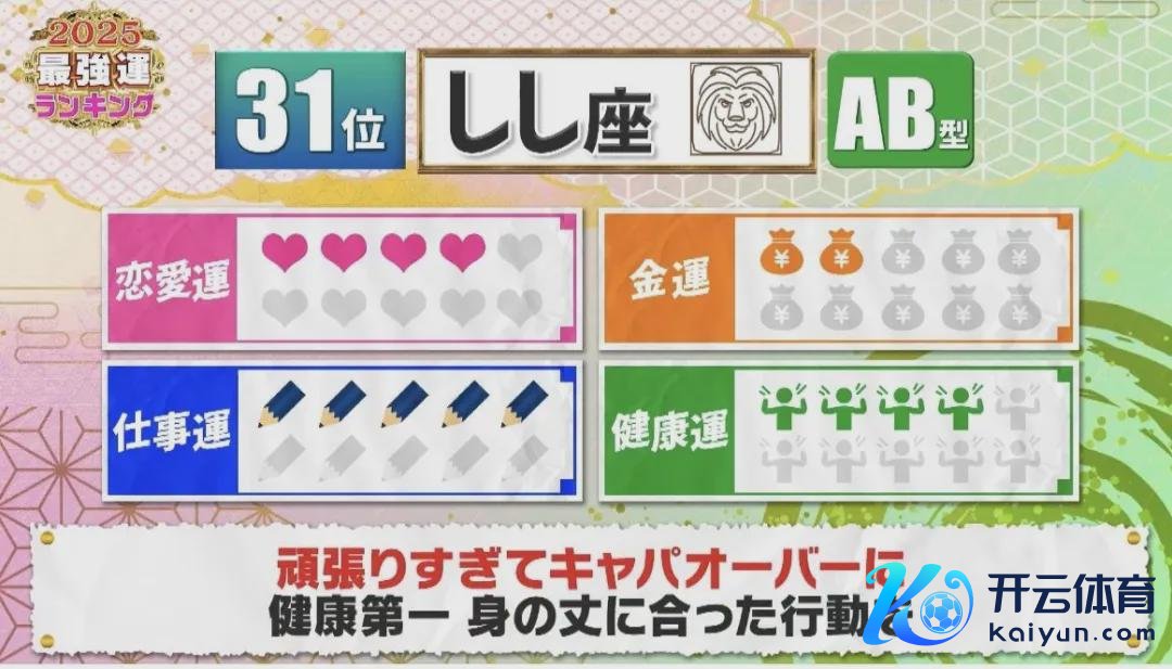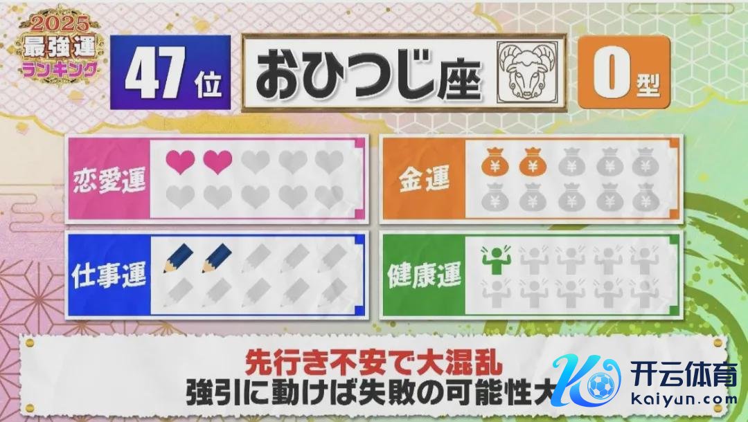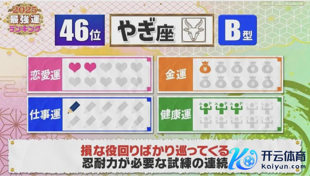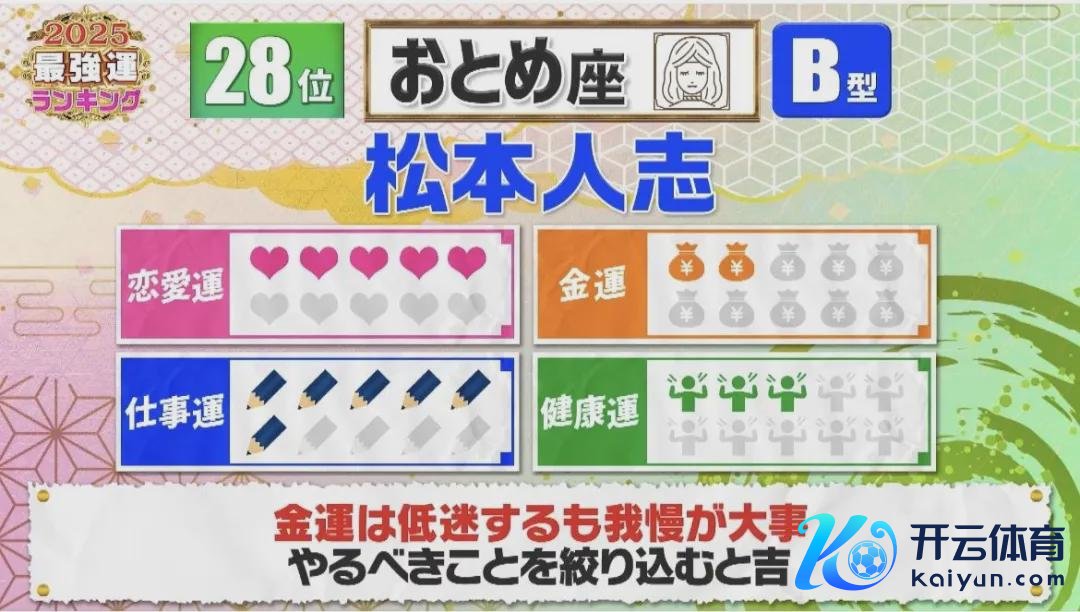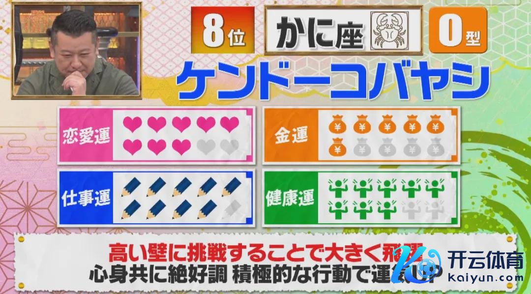 日本东谈主气综艺『ダウンタウンDX』,每年皆会邀请着名占卜师水晶玉子,劝诱星座和血型,从恋爱运、财气、使命运和健康运四个方面作念个大起底,排出1-48名的新年运势榜单。