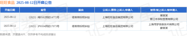 本站音尘,把柄天眼查APP深远,近日公布了2则上海旺旺食物集团有限公司手脚原告/上诉东说念主的开庭公告,案由为侵害商标权纠纷,开庭日历为2025年8月12日。负责本色如下: 数据开头:天眼查APP 以上本色为本站据公开信息整理开yun体育网,由AI算法生成(网信算备310104345710301240019号),不组成投资冷漠。