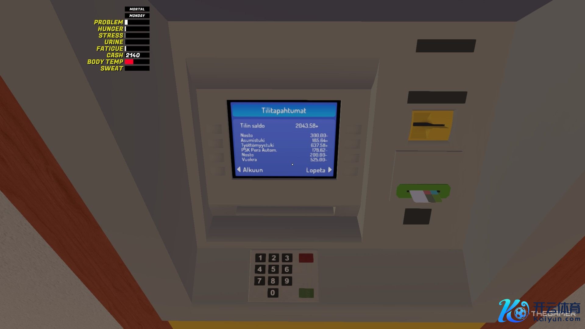 你会看到屏幕左上角的金额判辨,但那是你随身佩带的现款。你还有一个银行账户(和一张信用卡),即使游戏从未告诉你。你的账户里运行有 2,000 MK,是以你统共有 4,000 多 MK。